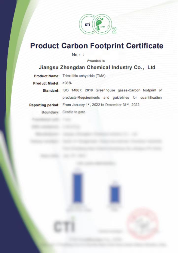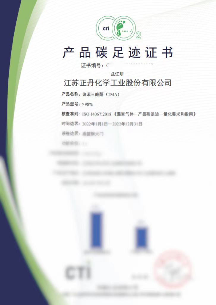 在国家“双碳”目标引领下,可持续发展、绿色转型已成为社会共识,各行业绿色低碳转型的步伐不断加快。近日,华测认证有限公司(以下简称“CTI华测认证”)为江苏尊龙凯时人生就是搏化学工业股份有限公司(以下简称“尊龙凯时人生就是搏股份”)旗下的偏苯三酸酐(TMA)产品颁发产品碳足迹证书。