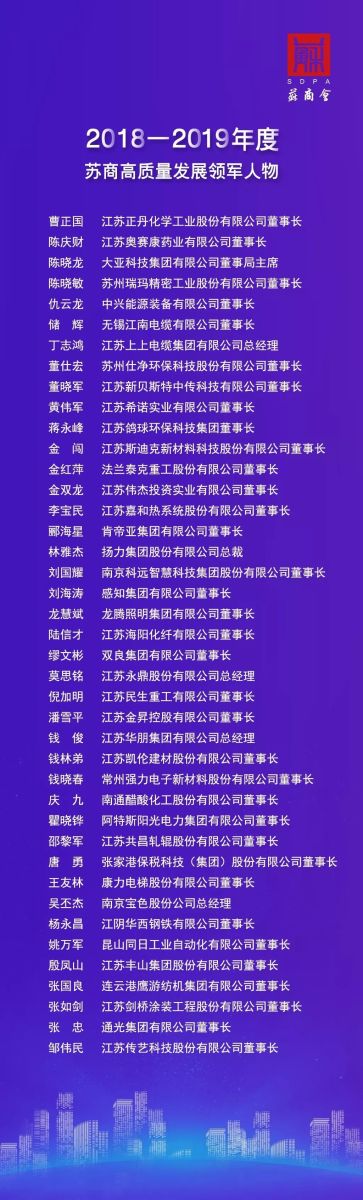 在本次大会上,为表彰江苏高质量发展中的推动者、领军者,苏商会颁发了“2018-2019年度苏商高质量发展领军人物”奖。江苏尊龙凯时人生就是搏化学工业股份有限公司董事长曹正国荣获“2018-2019年度苏商高质量发展领军人物”称号。