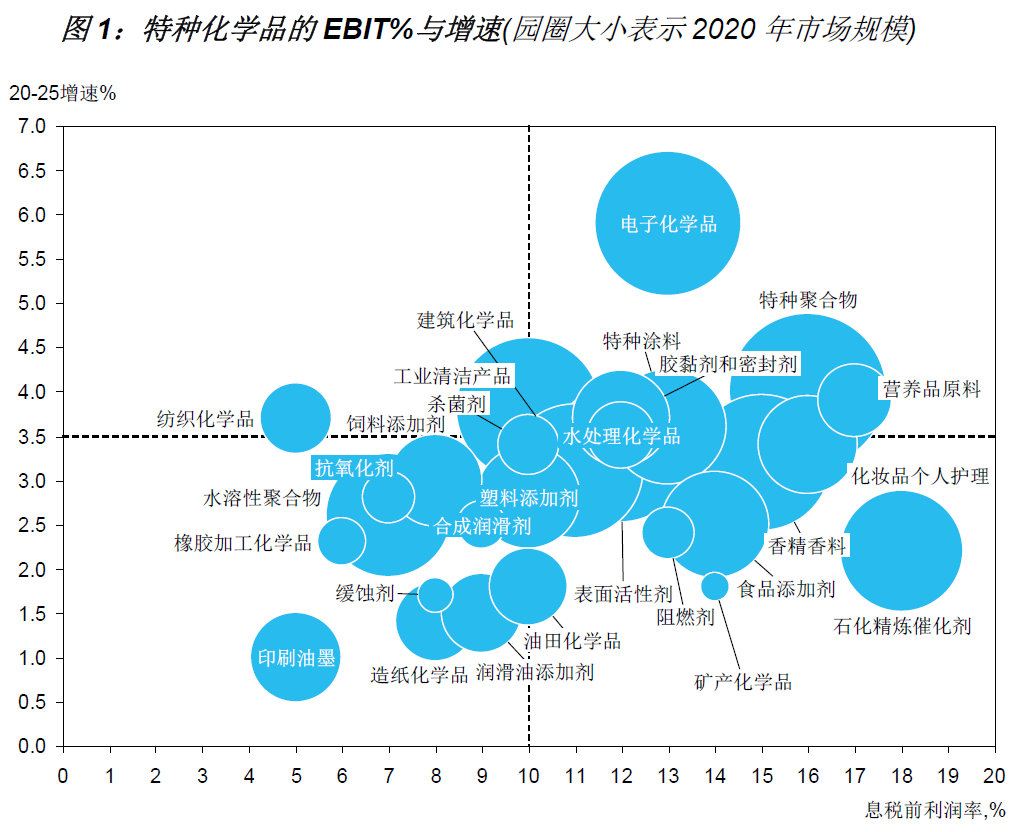未来5年,全球特种化学品的市场规模增长总体保持在3.6%的年均增速,预计到2025年全球特种化学品的市场规模接近7200亿美元。特种化学品属于高端精细化工产品,通常指技术含量高、产量小的化学品类,包含了特种聚合物、电子化学品、表面活性剂、香精香料、特种涂料、各类添加剂等主要类型,特种化学品更为靠近消费 终端,具有相对较高的盈利水平。