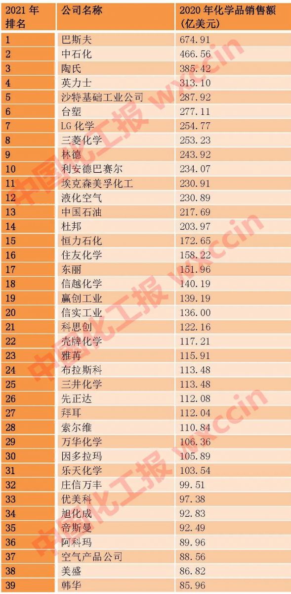 2021全球化工50强:中石化仍居亚军,中石油、恒力、万华、荣盛上榜(全名单)