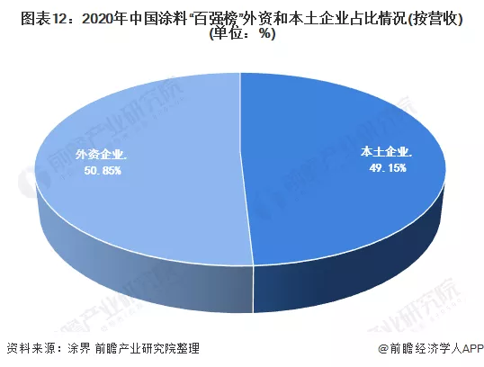 2、企业竞争:外资企业表现强势,立邦连年位居榜首2021年6月25日,涂界依据生产型企业2020年涂料业务营业收入进行排名,发布“2021中国涂料企业100强排行榜”。从“百强榜”来看,外资企业表现强势,外资企业(含港澳台)上榜29家,累计销售收入为731.731亿元,占榜单总销售收入的50.85%;本土上榜企业总销售收入仅占榜单的49.15%。