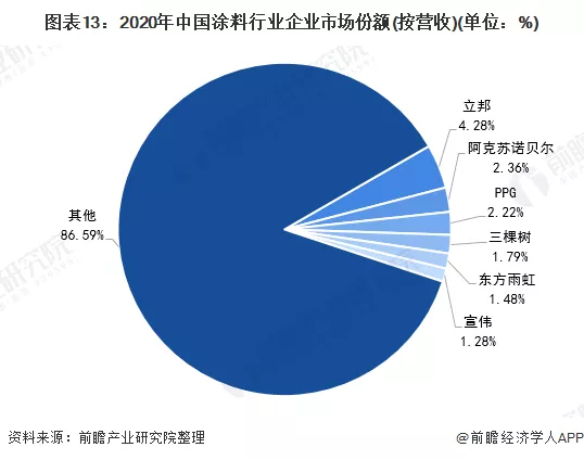 立邦2020年涂料营收达174.09亿元,连续多年位居全国第一,占全国市场份额的4.28%;其次是阿克苏诺贝尔、PPG和三棵树,分别占全国市场的2.36%、2.22%和1.79%。
