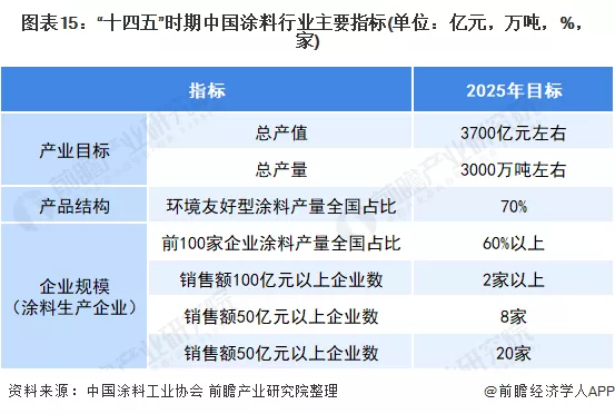 2、“十四五”涂料行业产值有望近四千亿元,产量有望达三千万吨根据涂料行业“十四五”发展总体目标,“十四五”期间,涂料全行业经济总量保持稳步增长,总产值年均增长4%左右。到2025年,涂料行业总产值预计增长到3700亿元左右;产量按年均4%增长计算,到2025年,涂料行业总产量预计增长到3000万吨左右。并且到2025年,环境友好的涂料品种占涂料总产量的70%。企业规模化方面,到2025年,销售额在100亿元以上的涂料生产企业达到2家以上,销售额在50亿元以上的涂料生产企业达到8家,销售额在10亿元以上的涂料生产企业达到20家。前100家涂料生产企业的涂料产量占总产量的60%以上。