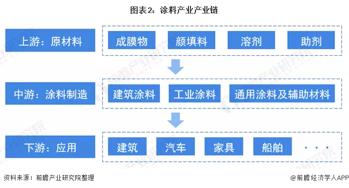 2、产业链剖析:原材料-生产-应用从产业链的角度来看,涂料的上游是原材料市场,中游是涂料生产制造,下游是产品需求市场。其中上游主要由涂料制造所需的四类原材料构成,包括以树脂为主的成膜物、颜填料、溶剂和助剂。从下游产品市场来看,涂料主要应用于建筑、汽车、船舶、家具等行业,是这些行业的配套产品。