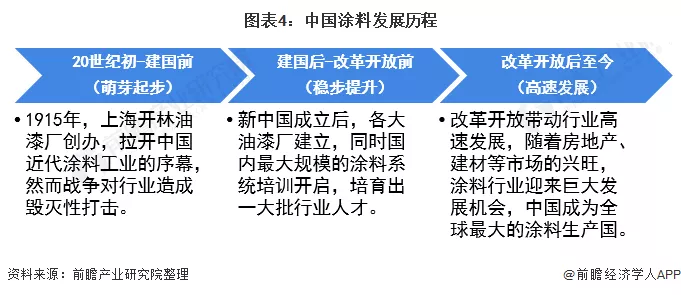 到1949年新中国成立,全国仅有50家油漆厂,从事涂料生产职工仅千人出头,年产量不足万吨,几十种涂料产品都是低档品种,中国以此为基础开启新中国涂料工业的发展。改革开放后,随着房地产、建材等市场的兴旺,涂料行业迎来巨大发展机会,并超越美国成为全球最大的涂料生产国。如今,中国已从涂料大国走向涂料强国,涂料行业也开始转型升级。