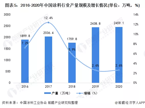 根据中国涂料工业协会数据显示,2017年中国涂料产量达到2036.4万吨,首次突破2000万吨大关。但是,受到近年中国房地产市场的影响,涂料行业的发展道路也越加坎坷,故中国规模以上涂料企业产量增速逐渐放缓。2020年,全国1968家规模以上涂料企业实现总产量2459.1万吨,同比增长2.6%。