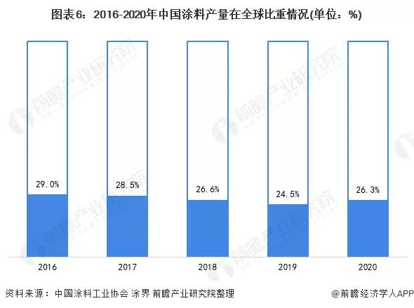 注:产量按规模以上企业“当年数据发布”统计口径统计,未随规模以上企业数量变化做调整;增幅为当年与上一年同企业数据比值,非实际值之比。根据涂界数据显示,2020年全球涂料总产量约为9350万吨,中国涂料产量占全球涂料产量的26.3%。并且从2016-2020年,中国涂料产量在全球一直保持较高的占比。