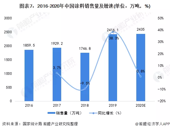 注:中国涂料产量为规模以上企业产量,不含规模以下企业产量。2、需求:国内涂料需求不断增长,但行业规模逐渐减小在我国涂料市场需求方面,由于涂料广泛应用于各种金属、木材、水泥、砖石、皮革、织物、塑料、橡胶、玻璃及纸张等制品表面,并且我国拥有庞大的房地产、汽车等行业体量,因此我国对于涂料需求的规模同样是非常大的。根据国家统计局的数据显示,2019年,我国涂料销售量为2416.1万吨,同比增长38.3%。初步计算,2020年我国涂料销售量约为2435万吨。