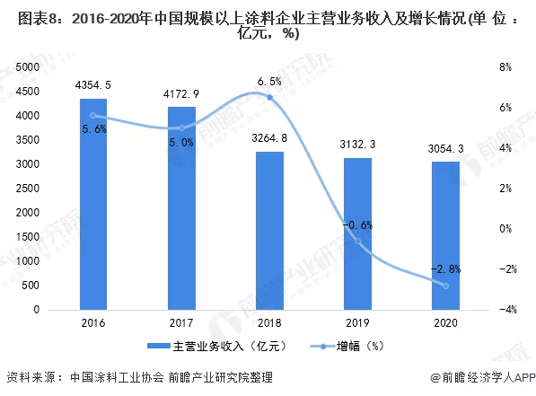注:销量按规模以上企业统计口径统计。在我国涂料市场规模方面,根据中国涂料工业协会数据显示,2017-2020年,中国规模以上涂料企业主营业务营收规模总量呈下滑趋势。2020年全国规模以上涂料企业实现营业收入3054.3亿元,同比下降2.8%。