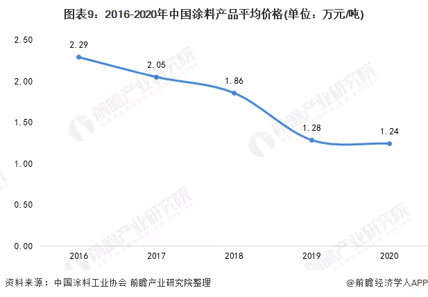 注:营收数据均为当年发布数据,非调整数据;增幅为当年与上一年同企业数据比值,非实际值之比。3、价格:产品平均价格持续下降虽然我国涂料生产和销售量呈上升趋势,但整个行业的营收却呈下降态势,主要在于我国涂料中低端产品同质化严重,竞争激烈,“价格战”越演越烈,导致行业产品整个价格出现下滑趋势。2020年,我国涂料行业产品平均价格降至1.24万元/吨。