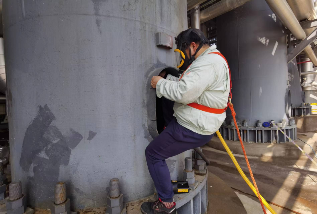 救援小组携带救援物资迅速赶至现场,检测塔釜内氧气和有毒气体浓度,确认安全后,用强光手电筒对塔釜内进行照明,所有动作连贯流畅。